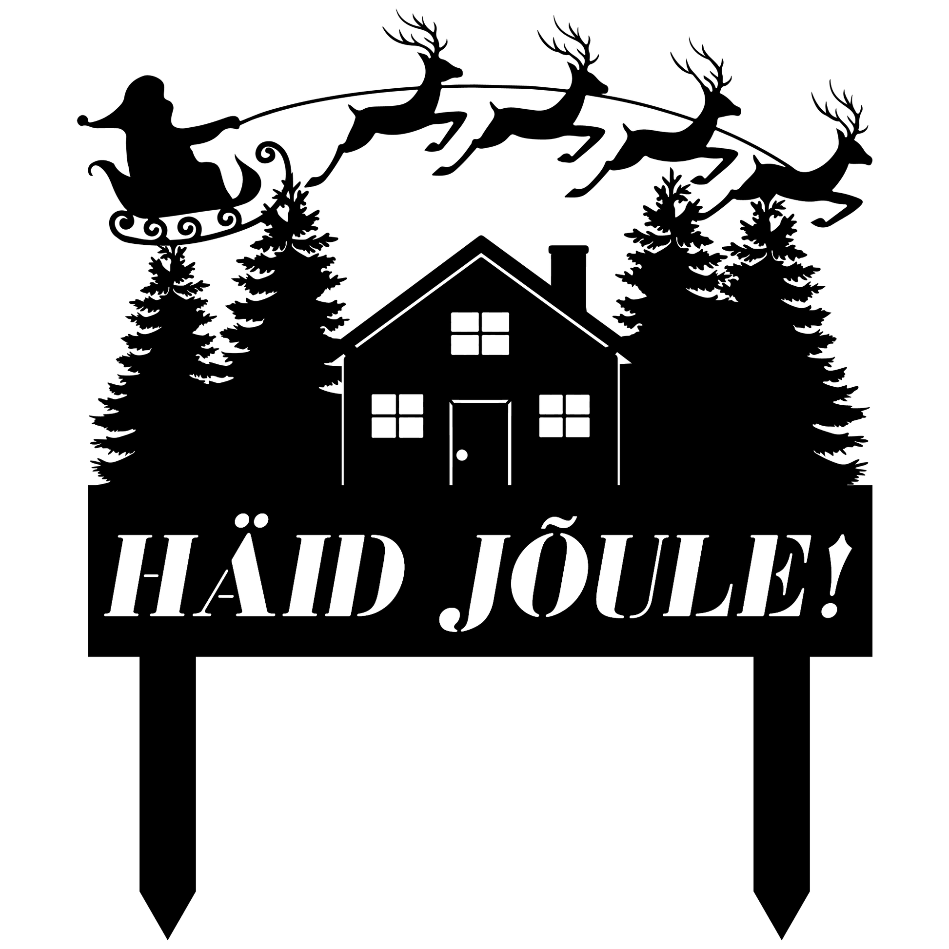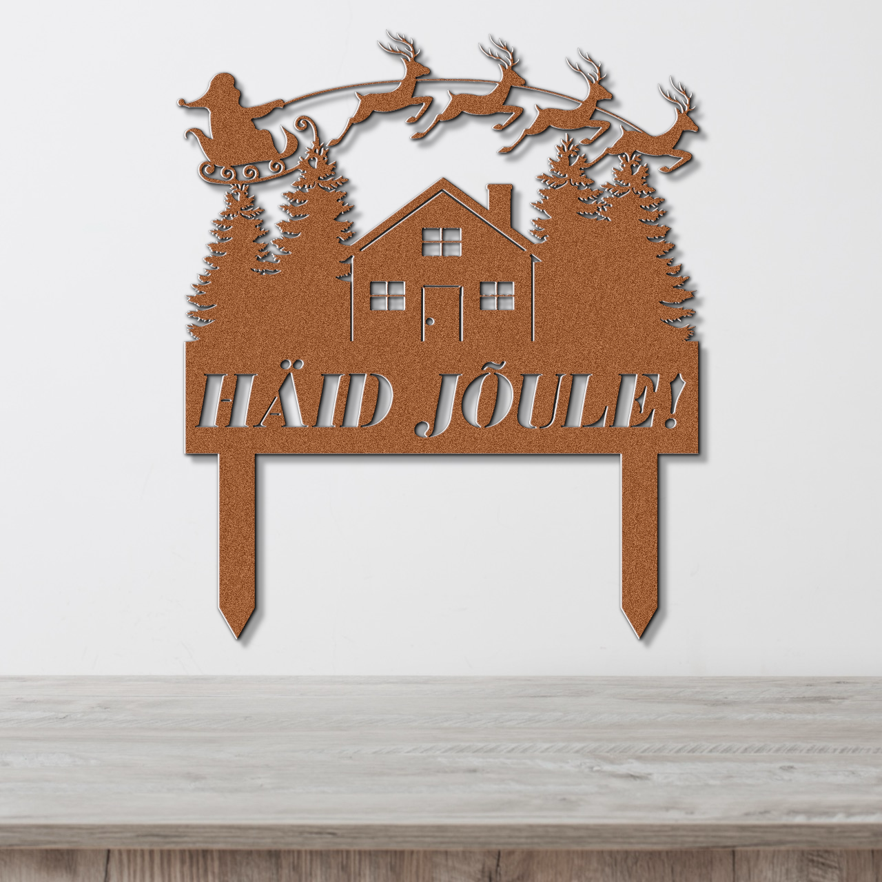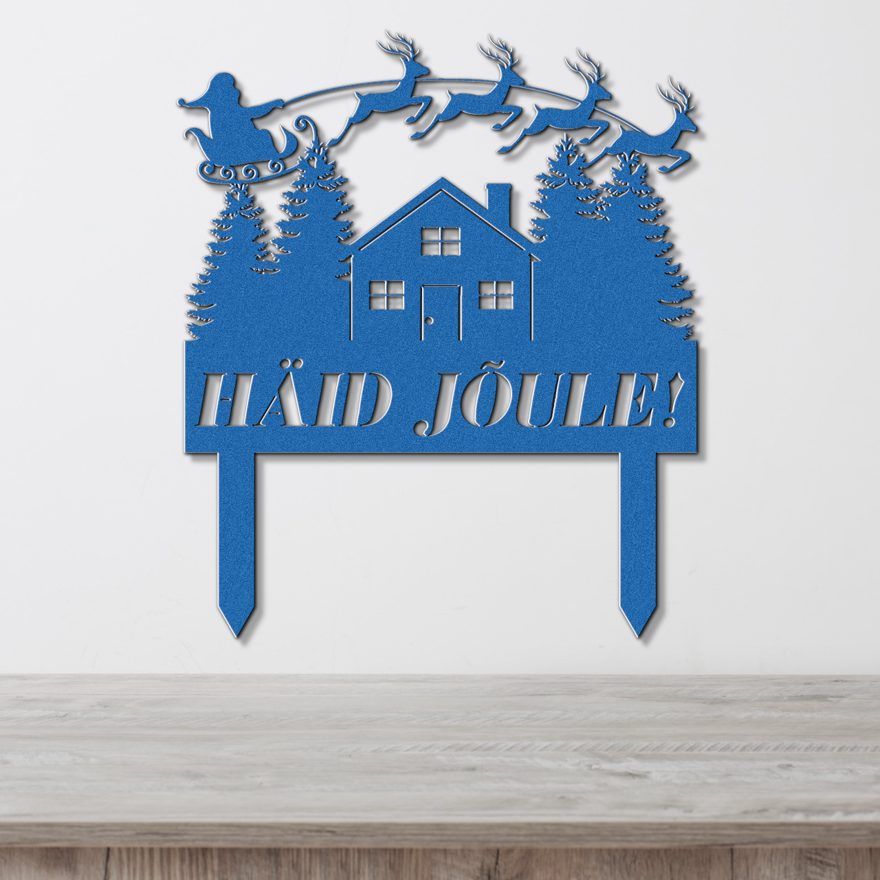 A beautiful Christmas sign that you can attach to the ground using stakes. It features Santa Claus with his sleigh and reindeers flying over a house and spruce trees.
