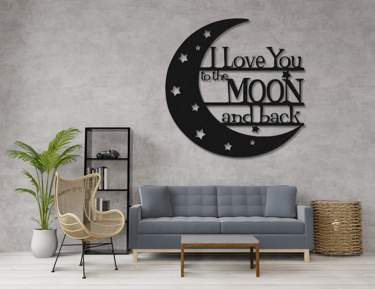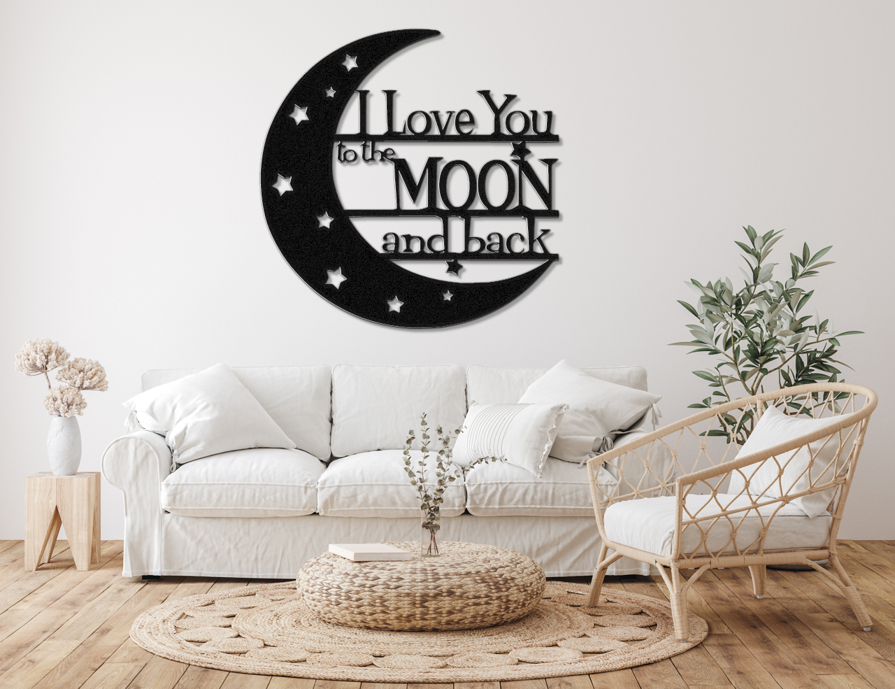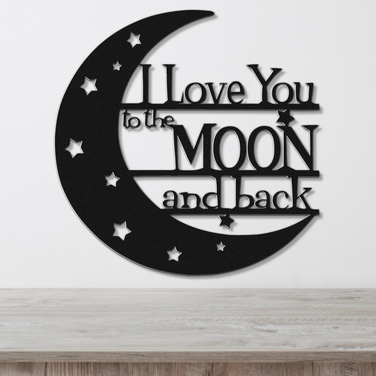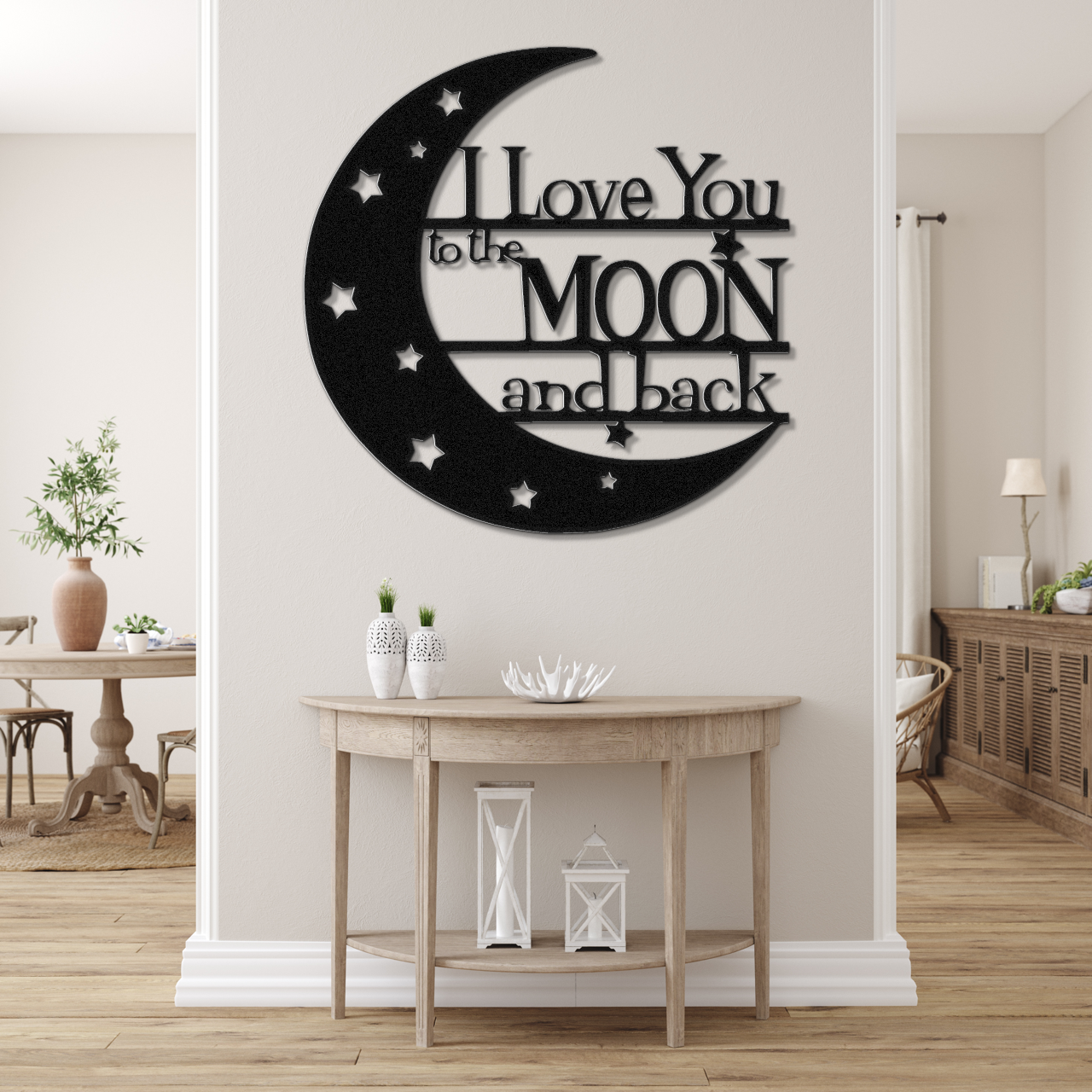 This charming metal sign features a beautifully crafted half-moon design, complete with delicate star-shaped cutouts. The moon is paired with the heartfelt phrase, “I love you to the moon and back,” elegantly inscribed across the sign. Perfect for adding warmth and sentiment to any space, this sign serves as a constant reminder of love and affection.