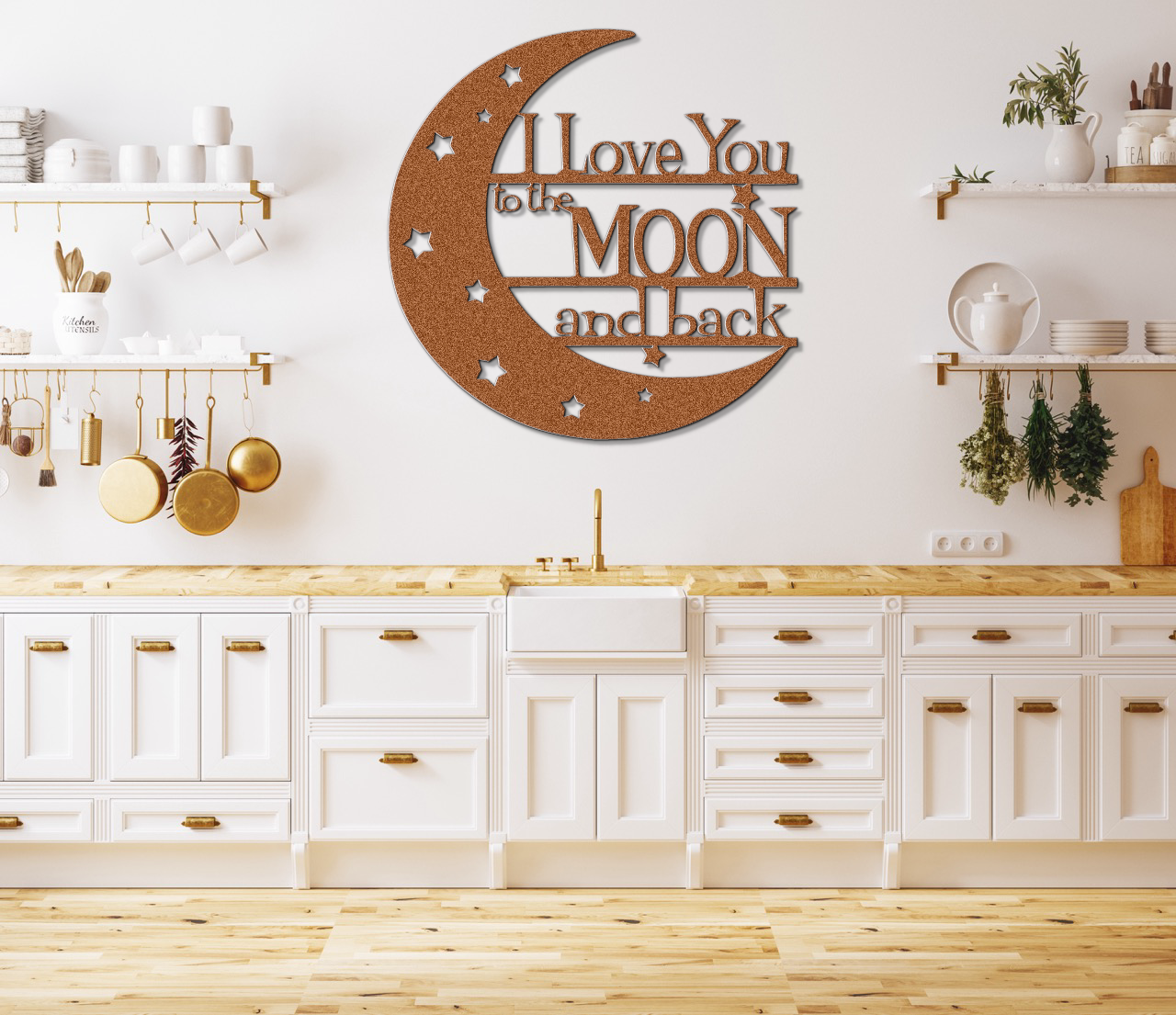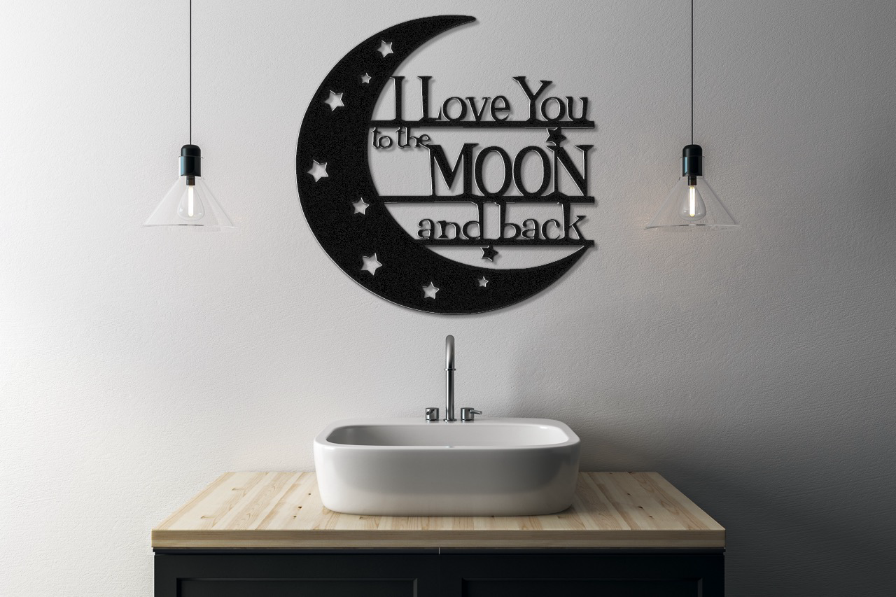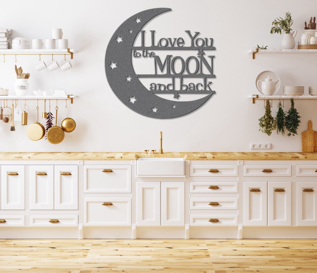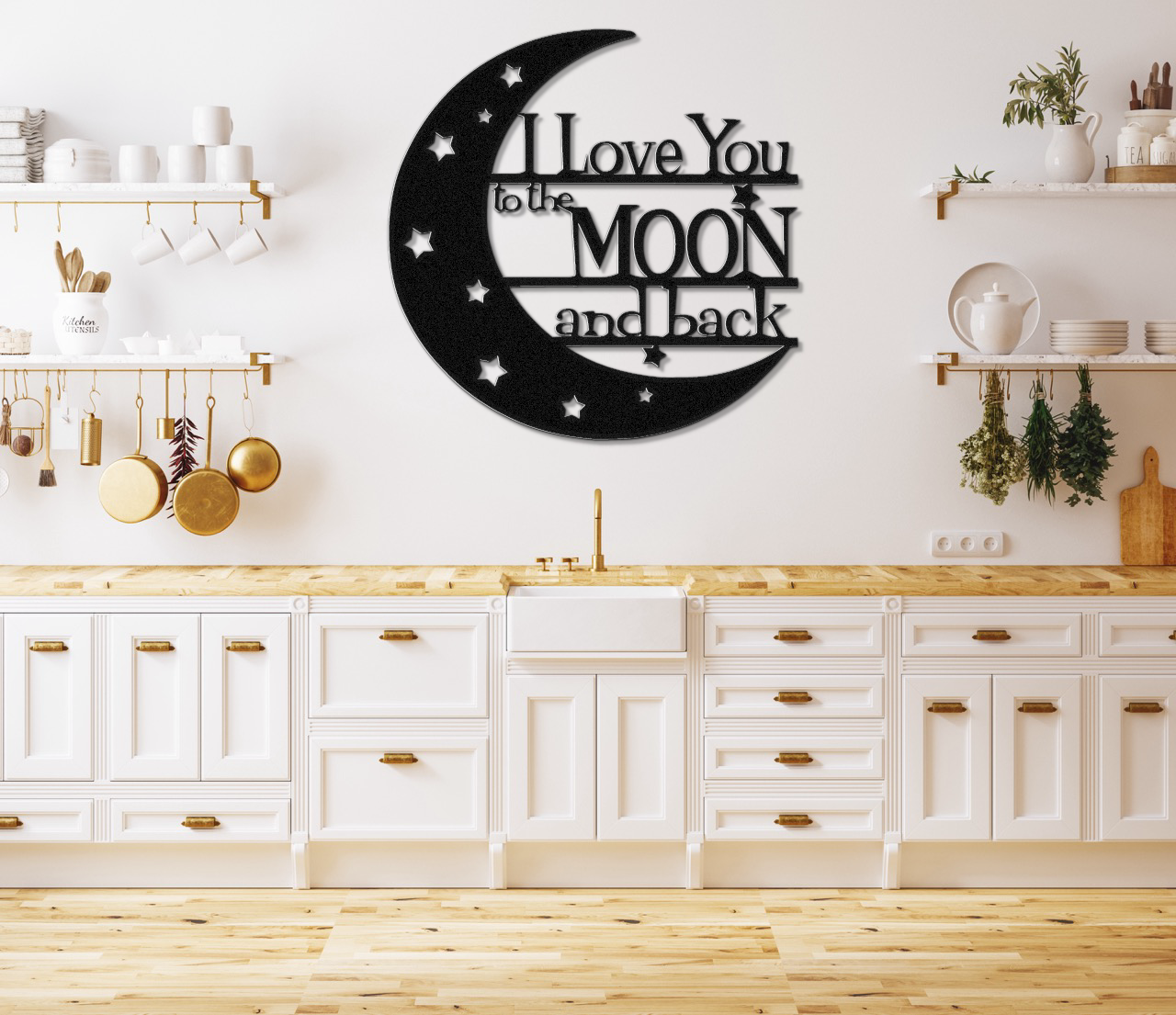 This charming metal sign features a beautifully crafted half-moon design, complete with delicate star-shaped cutouts. The moon is paired with the heartfelt phrase, “I love you to the moon and back,” elegantly inscribed across the sign. Perfect for adding warmth and sentiment to any space, this sign serves as a constant reminder of love and affection.