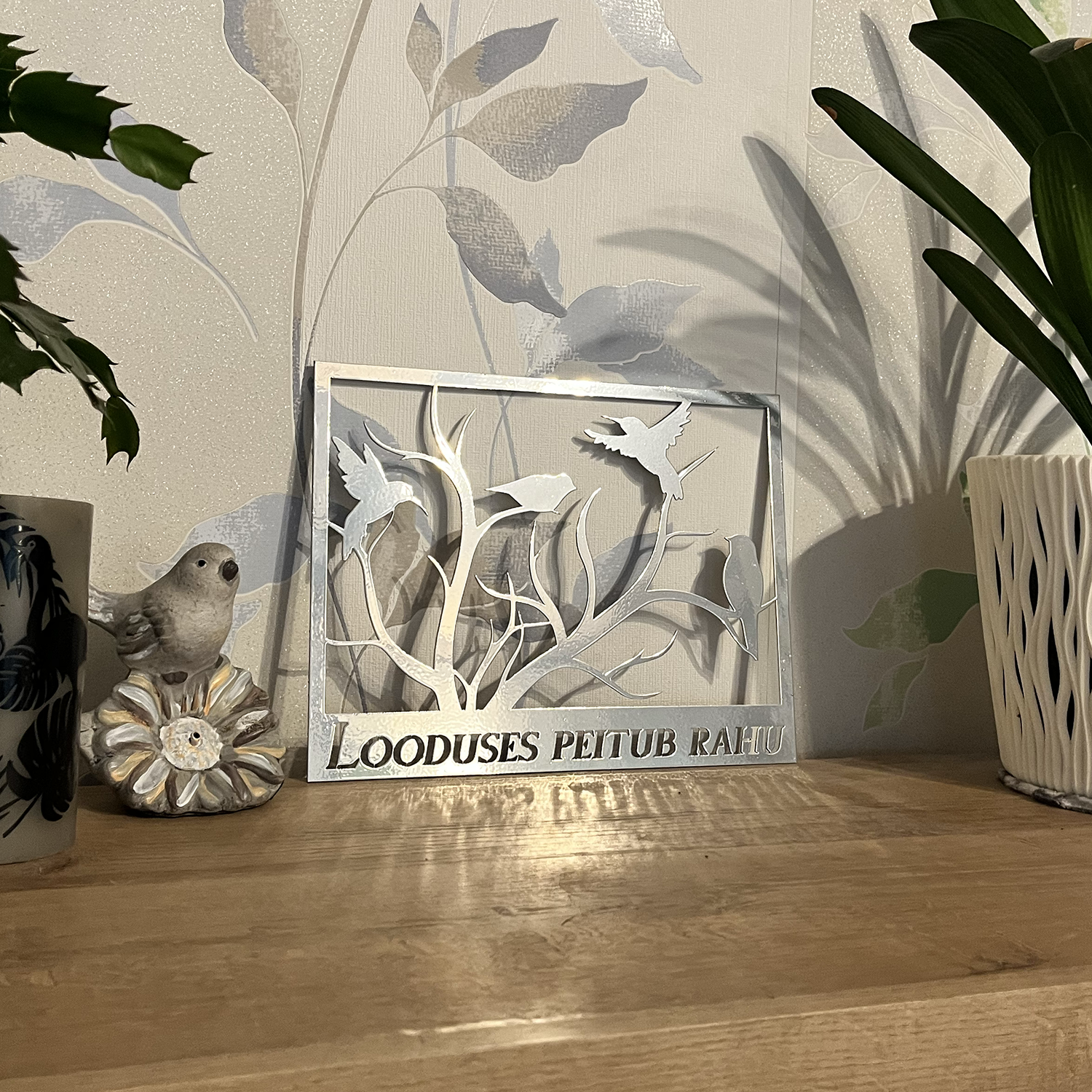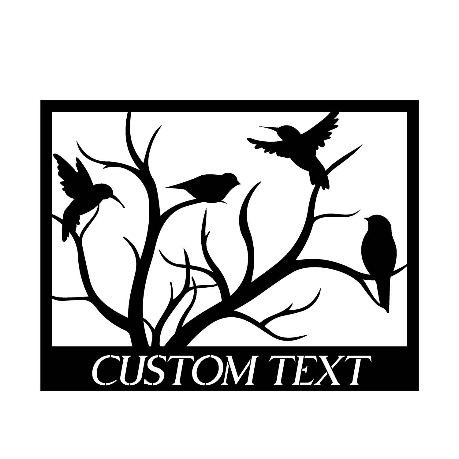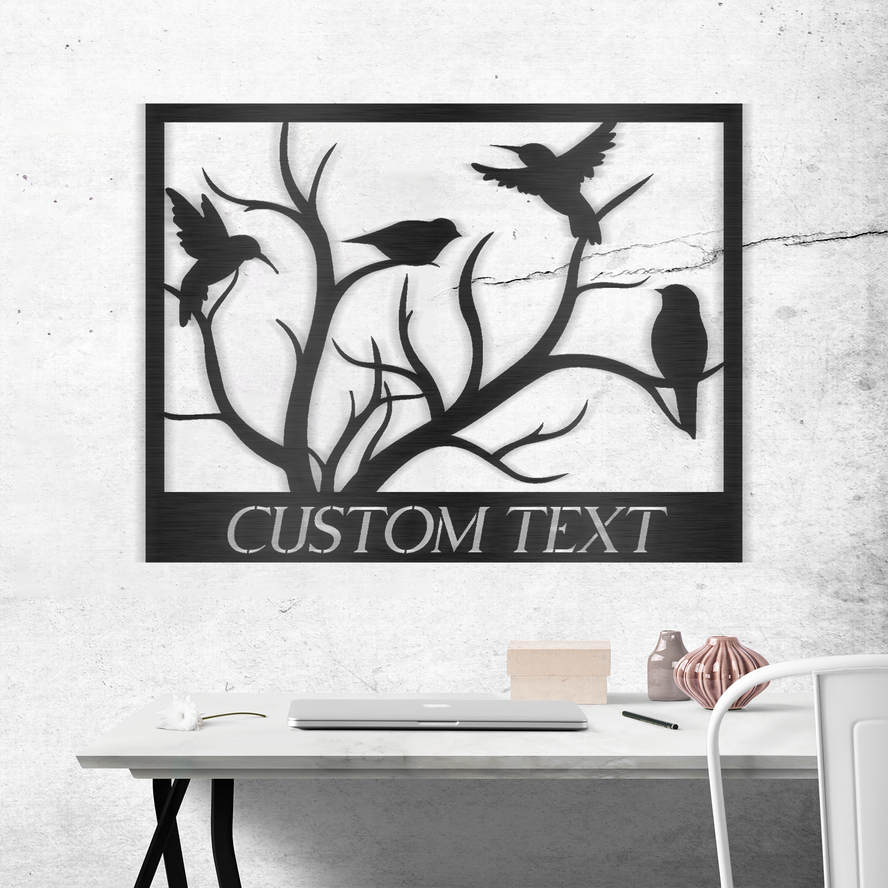 Brighten up your space with our charming metal sign, featuring birds perched on tree branches. Personalise it with any text you like, making it uniquely yours. Crafted from durable metal, it's perfect for indoor or outdoor display, bringing a touch of nature’s tranquility to any setting. Ideal for bird lovers and those who appreciate the beauty of nature, this sign is a simple yet beautiful way to add personality and a peaceful vibe to your home.